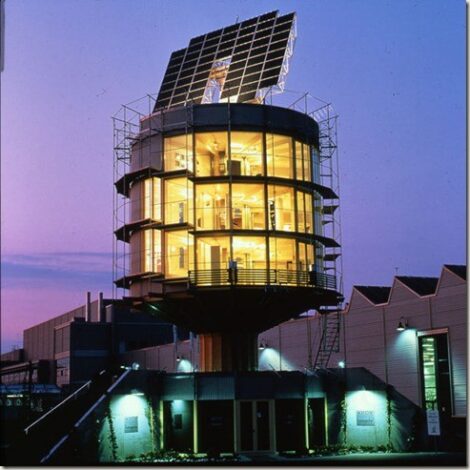 هذا ما يفعله مبنى الهيليوتروب حيثُ يُعدُّ أول منزل دوَّار في العالم استفاد من التكنولوجيا البيئيّة. على سطحهِ منصَّة أو وحدات أو ألواح شمسيّة كبيرة تُدار (بالكمبيوتر)، تُستخدم في جمع الحرارة الشَّمسيّة من أجلِ إنتاج القوّة (الطّاقة) ولتسخين المياه وتدفئتها؛ ما يعني استهلاكًا أقلّ للكهرباء.